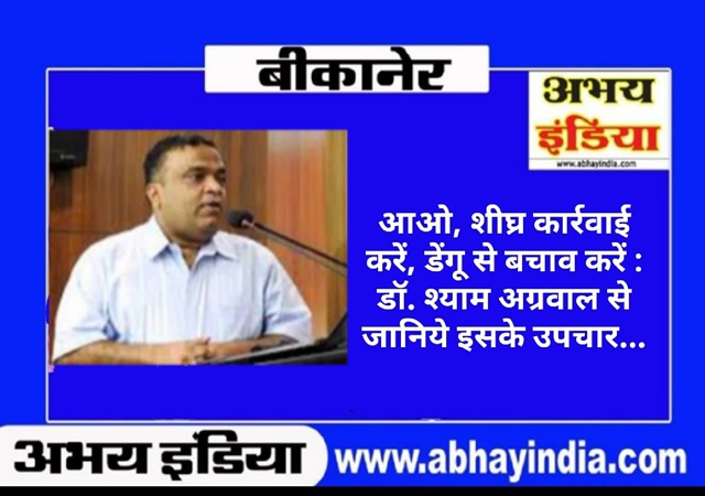 आइए हम सभी मिलकर डेंगू से बचाव के लिए जागरूकता फैलाएं। -डॉ. श्याम अग्रवाल, शिशु रोग विशेषज्ञ, डॉ. श्याम अग्रवाल चिल्ड्रन एंड जनरल हॉस्पिटल, जस्सूसर गेट के बाहर, बीकानेर
