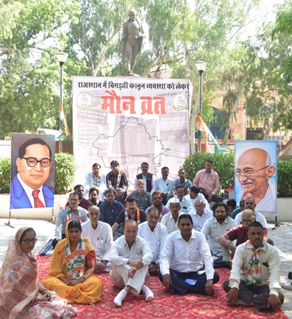 बिगड़ती कानून व्यवस्थाओं को लेकर गांधी प्रतिमा के सामने कांग्रेस नेताओं ने किया मौन व्रत
