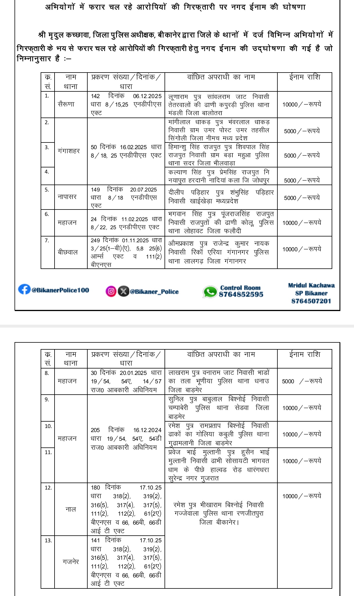 बीकानेर Abhayindia.com बीकानेर में विभिन्‍न पुलिस थाना क्षेत्रों में लंबे समय से फरारी के भय से पुलिस की नजरों से बच रहे अपराधियों को दबोचने के लिए सिस्‍टम अलर्ट मोड है। पुलिस अधीक्षक मृदुल कच्छावा ने एक दर्जन फरार अपराधियों पर अलग-अलग राशि के इनाम की घोषणा की है।