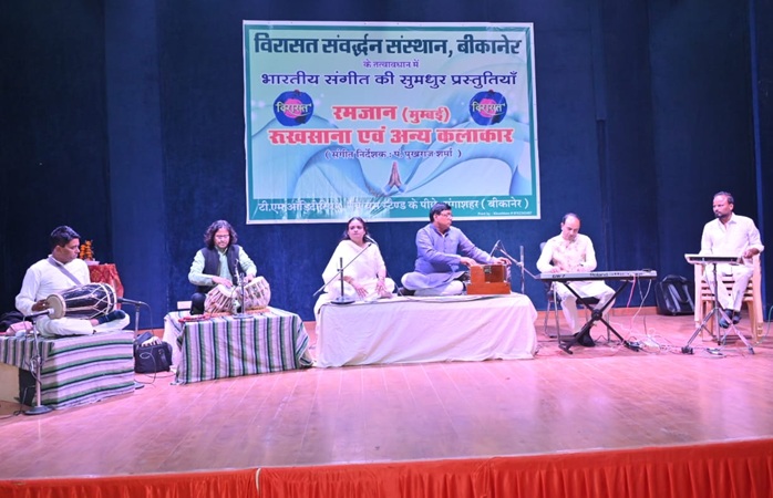 बीकानेर Abhayindia.com विरासत संवर्द्धन संस्थान द्वारा भारतीय संगीत की सुमधुर सांस्कृतिक संध्या का आयोजन रविवार शाम गंगाशहर स्थित टी.एम. ऑडिटोरियम में हुआ। कार्यक्रम के शुभारम्भ में मां सरस्वती के समक्ष संस्थान के अध्यक्ष टोडरमल लालाणी, जैन महासभा के नव निर्वाचित अध्यक्ष कन्हैयालाल बोथरा, हुलासमल लालानी, एडवोकेट किशनलाल बोथरा, सम्पतलाल दूगड़ ने दीप प्रज्वलन किया। ख्यातनाम संगीत गुरु पं. पुखराज शर्मा ने भावपूर्ण शैली में सरस्वती वन्दना की। सुमधुर गायिका सीमा सिंह शेखावत ने आवाज दे कहां है व बुझ मेरा क्या नाम रे… गीत प्रस्तुत किये तो श्रोताओं ने तालियां बजाकर उन्हें सराहा।